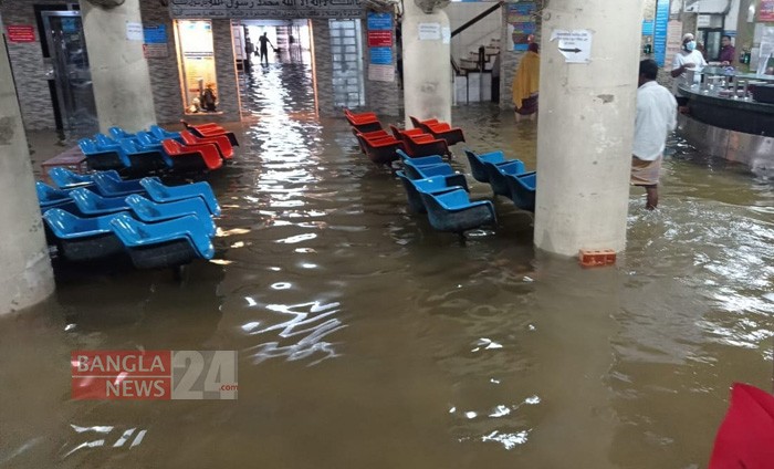 ভারী বৃষ্টিতে তলিয়ে গেছে আগ্রাবাদ মা ও শিশু হাসপাতালের নীচ তলা। ছবি: উজ্জ্বল ধর