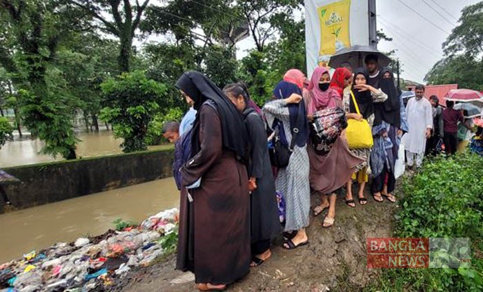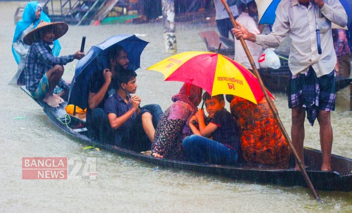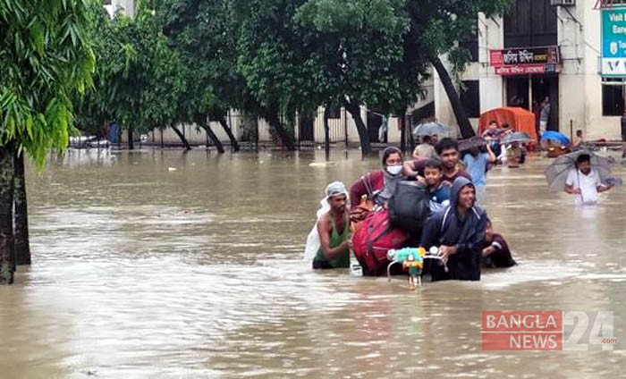 সিলেট নগরীর উপশহর এলাকা থেকে নিরাপদ আশ্রয়ের খোঁজে বন্যার্ত মানুষ। ছবি: মাহমুদ হোসেন