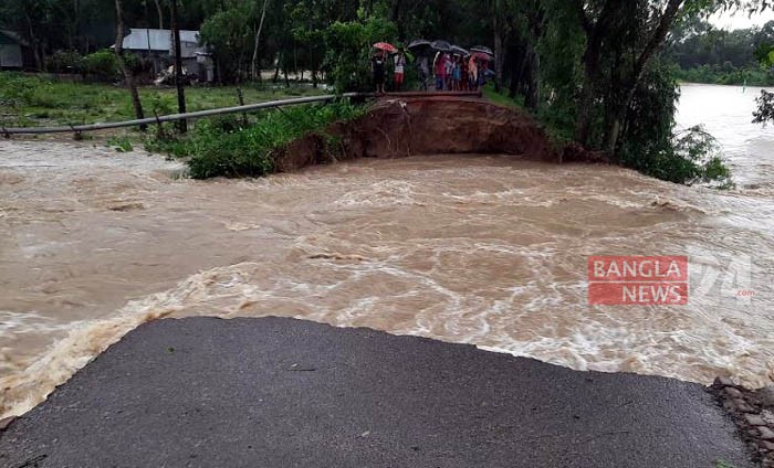 ভারতেপ ত্রিপুরার রাজ্যের পাহাড়ি ঢলে ব্রাহ্মণবাড়িয়ার আখাউড়ায় আইড়ল গ্রামে যাওয়ার সড়কটি দ্বিখণ্ডিত হয়ে গেছে। ছবি: মেহেদী নূর