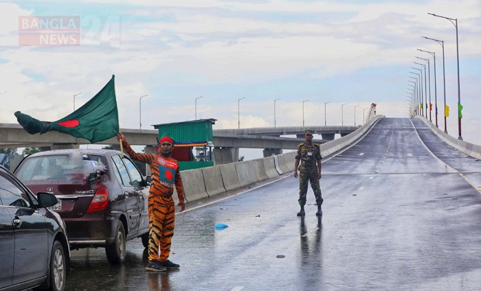 রয়েল বেঙ্গল টাইগারের আদলে বানানো পোশাক পরে পদ্মা সেতুর একাংশে দাঁড়িয়ে জাতীয় পতাকা ওড়াচ্ছেন টাইগার শোয়েব আলী। ছবিটি মাওয়া প্রান্ত থেকে তুলেছেন ডিএইচ বাদল।