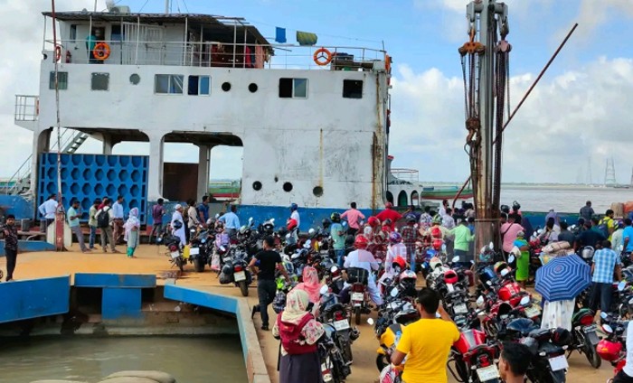 পদ্মা সেতুতে হঠাৎই মোটরসাইকেল নিষিদ্ধ করা হয়েছে। এজন্য ফেরিতে মোটরসাইকেল নিয়ে নদী পার হচ্ছে মানুষ। ছবি: ডিএইচ বাদল