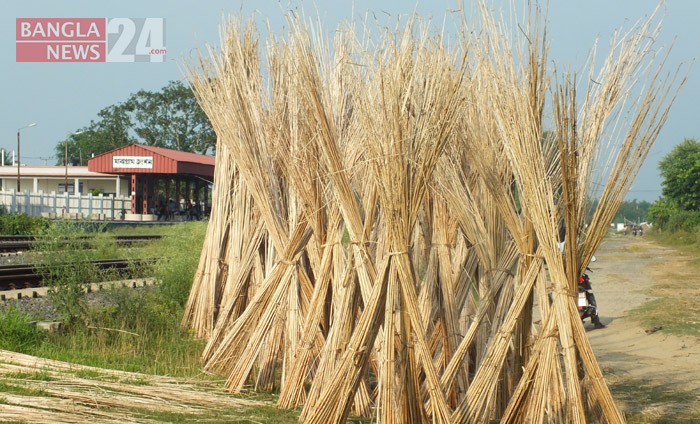 পাটের আঁশ ছাড়ানোর পর সারিসারি সাজিয়ে রৌদে শুকানো হচ্ছে। ছবিটি ঈশ্বরদী-ঢাকা রেলরুটে মাঝগ্রাম জংশন স্টেশন থেকে তুলেছেন টিপু সুলতান।