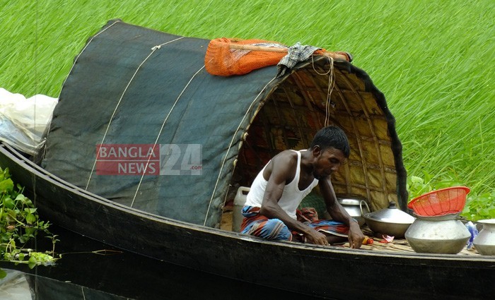 নৌকায় বসে খাবার খাচ্ছেন এক জেলে। দৃশ্যটি পাবনার চাটমোহর উপজেলা থেকে তুলেছেন টিপু সুলতান।