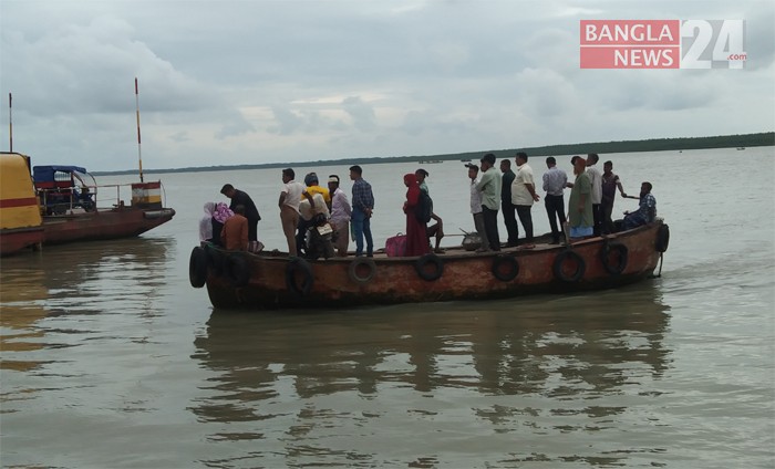 বৈরী আবহাওয়ার মধ্যে ট্রলারে করে বরগুনা বিষখালী নদী পার হচ্ছে দুই পাশের মানুষ। ছবি: জাহিদুল ইসলাম মেহেদী