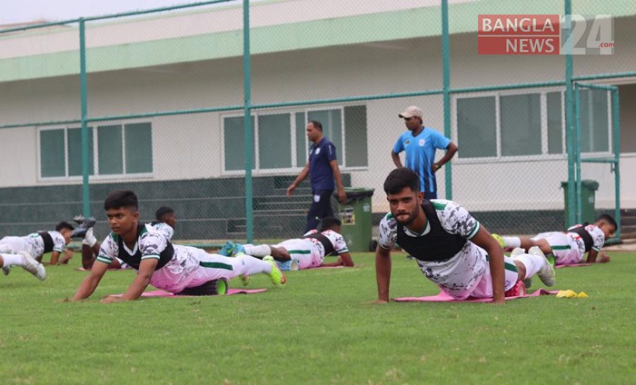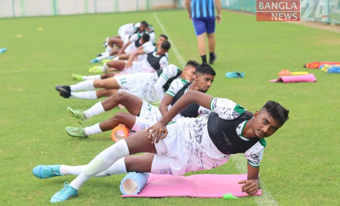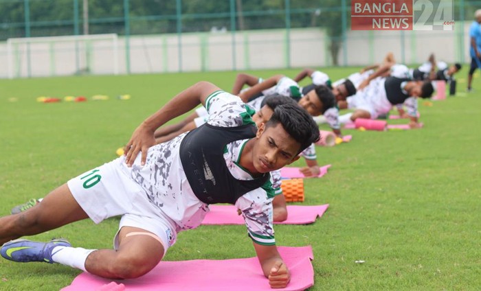 বাংলাদেশ অনূর্ধ্ব-২০ ফুটবল দলের অনুশীলন চলছে। ছবি: শোয়েব মিথুন