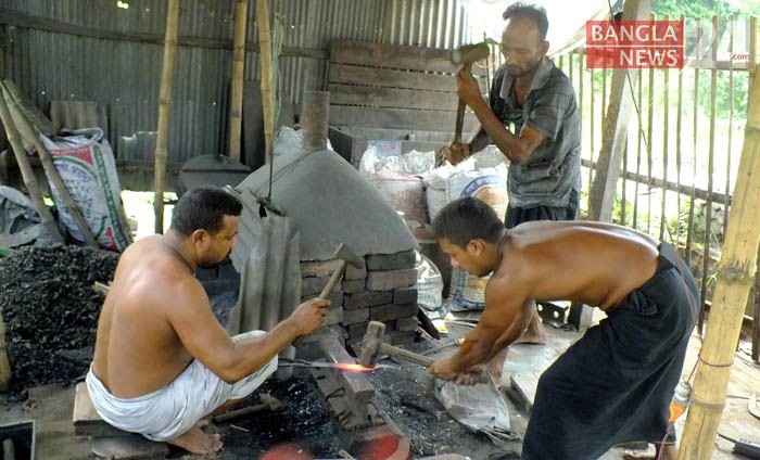 লোহা পিটিয়ে সরঞ্জাম প্রস্তুতে ব্যস্ত কামার শিল্পের কারিগররা। পাবনার ঈশ্বরদী উপজেলার সাঁহাপুর ইউনিয়নের আলহাজ্ব মোড় থেকে ছবিটি তুলেছেন টিপু সুলতান।