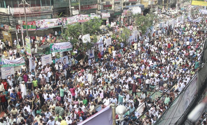 বিকেল সোয়া ৩টার দিকে রাজধানীর নয়া পল্টনে বিএনপির কেন্দ্রীয় কার্যালয়ের সামনে আয়োজিত প্রতিবাদ সমাবেশে লাখো নেতাকর্মীর ঢল। ছবি: ডিএইচ বাদল