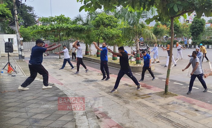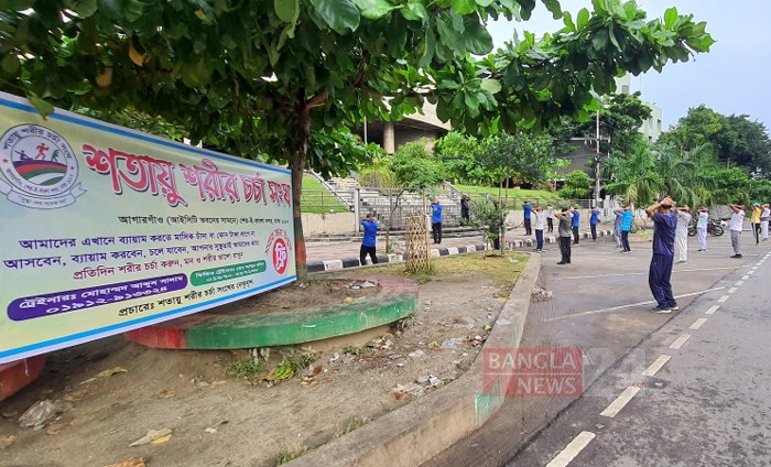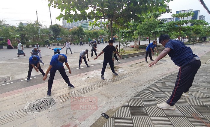 প্রতিদিন ভোরে ফ্রি শারীরিক নানা রকম কসরত করাচ্ছে শতায়ু শরীর চর্চা সংঘ। ছবিটি নির্বাচন কমিশনের সামনে থেকে তুলেছেন জি এম মুজিবুর।