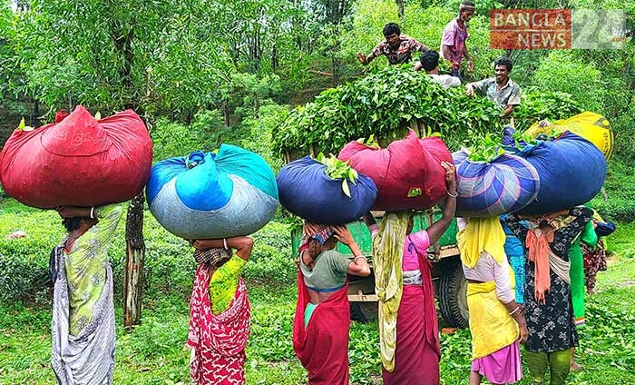 চা-বাগান থেকে পাতা তুলে বোঝা মাথায় নিয়ে সারিবদ্ধভাবে ফিরছেন শ্রমিকরা। ছবি: মাহমুদ হোসেন