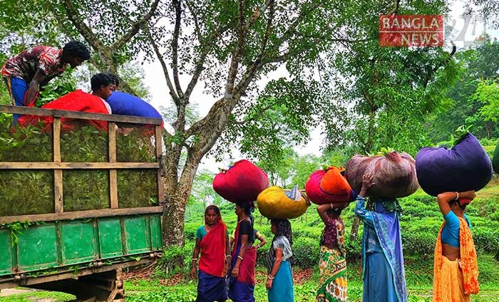 চা-বাগান থেকে পাতা তুলে ট্রাকে তুলে দিচ্ছেন শ্রমিকরা। ছবি: মাহমুদ হোসেন