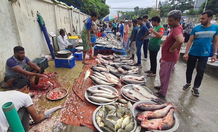 ভোর ছয়টা থেকে দশটা পর্যন্ত তাজা মাছের ভাসমান দোকান বসে আগারগাঁও মহিলা পলিটেকনিক্যালের সামনে। ছবি: জি এম মুজিবুর
