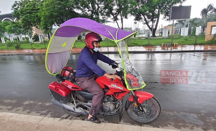 রেইনকোটের বিকল্প হিসাবে ব্যবহার করছেন ছাতা। শেরেবাংলা এলাকা থেকে ছবিটি তুলেছেন জি এম মুজিবুর।