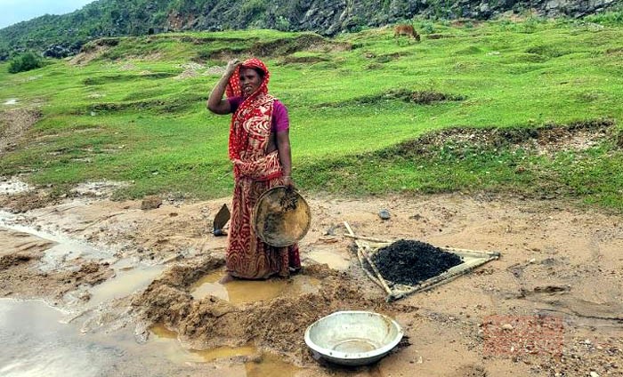 ভারতের মেঘালয় থেকে নেমে আসা ঝিরি থেকে কয়লা সংগ্রহ করছেন এক নারী। সুনামগঞ্জ জেলার তাহিরপুর উপজেলার নিলাদ্রী লেক সংলগ্ন এলাকা থেকে ছবিটি তুলেছেন জয়ন্ত জোয়ার্দ্দার