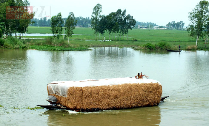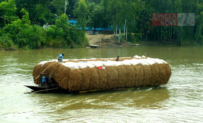 বিলাঞ্চলে গবাদি পশুর গো-খাদ্যের সংকটের কারণে অন্য জেলা থেকে ইঞ্জিনচালিত নৌকায় করে আনা হচ্ছে খড়। ছবিটি পাবনার ভাঙ্গুড়া উপজেলার পার-ভাঙ্গুড়া ইউনিয়নে ‘গুমানী’ নদী থেকে ছবিটি তুলেছেন টিপু সুলতান