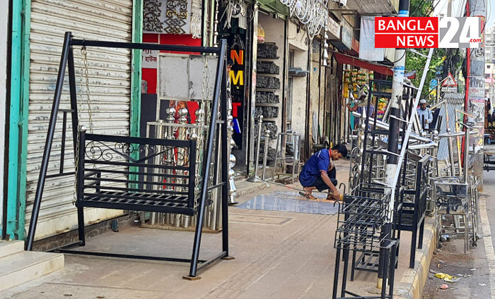 ফুটপাত দখল করে রাখা হয়েছে দোকানের পণ্য। মিরপুর দুই নম্বর নুরানী মসজিদ এলাকা থেকে ছবিটি তুলেছেন জি এম মুজিবুর।