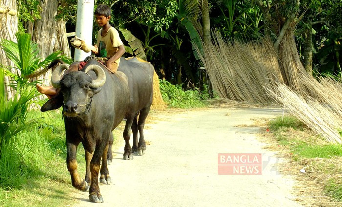 গ্রামের মেঠোপথে মহিষের পিঠে চড়ে মহিষ চড়াতে যাচ্ছে এক শিশু। ঈশ্বরদীর লালপুর উপজেলার পাটিকাবাড়ি গ্রাম থেকে ছবিটি তুলেছেন টিপু সুলতান।
