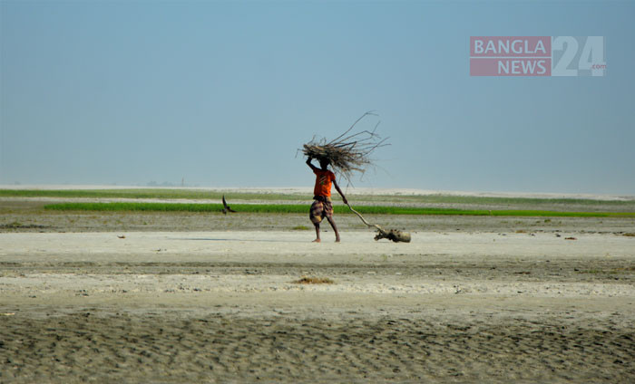 ব্রহ্মপুত্র নদের পানির তোড়ে ভেসে আসা খড়কুটো সংগ্রহ করে নিয়ে যাচ্ছে স্থানীয় একজন। ছবিটি কুড়িগ্রাম থেকে তুলেছেন ফজলে এলাহী স্বপন।
