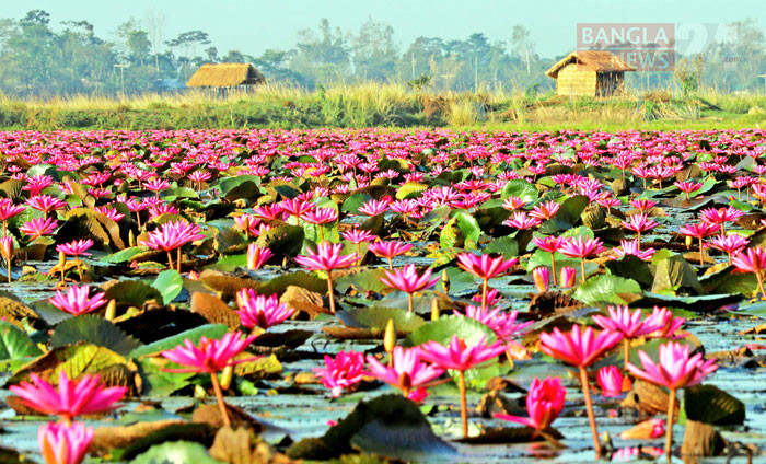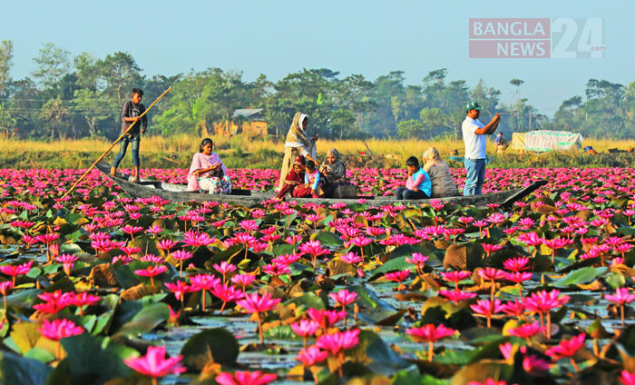 সিলেটের জৈন্তাপুরের ডিবির হাওরে পর্যটকদের আকৃষ্ট করছে লাল শাপলার বিল, ছবি: মাহমুদ হোসেন