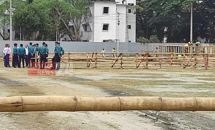 প্রধানমন্ত্রীর চট্টগ্রামের সমাবেশ উপলক্ষে পোলোগ্রাউন্ড মাঠে জোরদার নিরাপত্তা ব্যবস্থায় প্রস্তুত করা হচ্ছে মঞ্চ। ছবি: উজ্জ্বল ধর