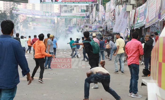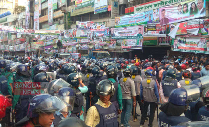 নয়া পল্টনের কেন্দ্রীয় কার্যালয়ের সামনে পুলিশের সঙ্গে বিএনপি নেতাকর্মীদের সংঘর্ষ। ছবি: ডিএইচ বাদল।