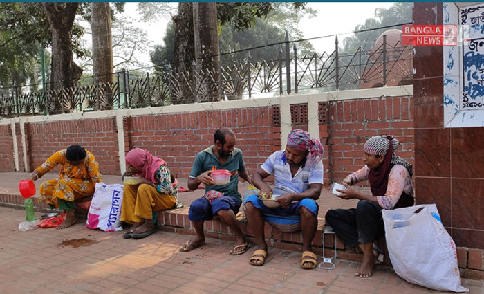 স্মৃতিসৌধের সৌন্দর্য বর্ধকের কাজের মাঝে স্বস্তিতে দুপুরের খাবার খাচ্ছেন শ্রমিকরা। ছবি তুলেছেন সাগর ফরাজী