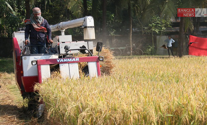 হার্ভেস্টার মেশিন দিয়ে ধান কাটায় ব্যস্ত শ্রমিক। বরিশাল সদর উপজেলার লাকুটিয়া থেকে ছবিটি তুলেছেন এন আমিন রাসেল।
