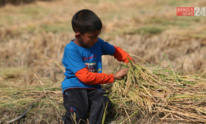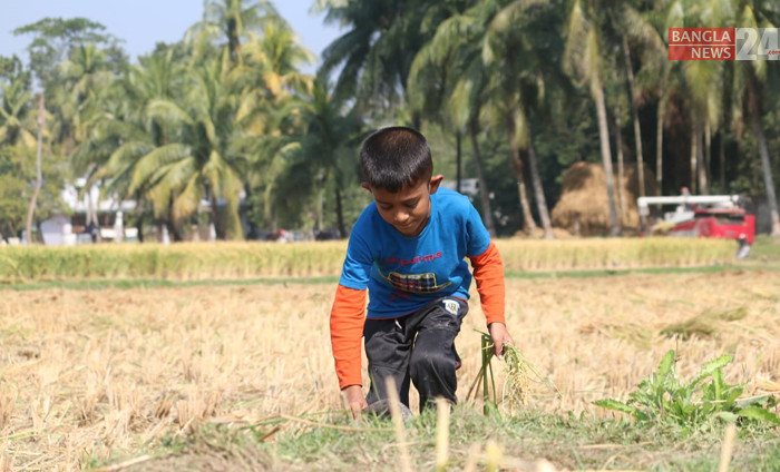 ক্ষেত থেকে কাটা ধান কুড়াতে ব্যস্ত এক শিশু। ছবি: এন আমিন রাসেল