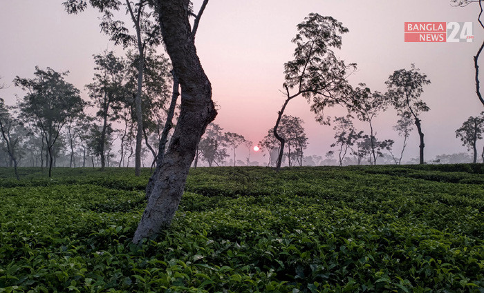 কুয়াশাঘেরা চা বাগানের সূর্য চিহ্নময় প্রকৃতি। ছবি: বিশ্বজিৎ ভট্টাচার্য বাপন