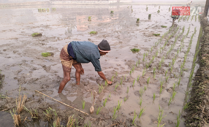 বোরো ধান বুনছেন কৃষক। ছবি: বিশ্বজিৎ ভট্টাচার্য বাপন
