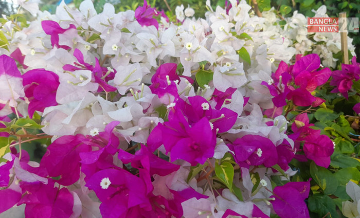 এক গাছে দুই প্রকারের বাগান বিলাস ফুল ফুটেছে। ছবি: জি এম মুজিবুর