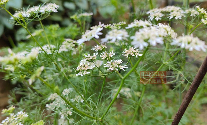 ধনিয়া গাছে ফুল এসেছে। সাভারের ন্যাশনাল ইনস্টিটিউট অব বায়োটেকনোলজি (এনআইবি) থেকে ছবিটি তুলেছেন সাগর ফরাজী।