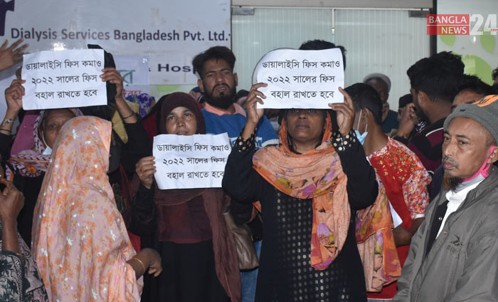 চট্টগ্রাম মেডিকেল কলেজ হাসপাতালে কিডনি রোগীদের ডায়ালাইসিস ফি বাড়ানোর প্রতিবাদে শনিবার বিকেলে বিক্ষোভ করেন রোগীর স্বজনরা। ছবি: উজ্জ্বল ধর