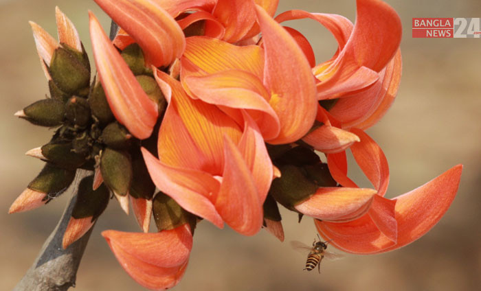 পলাশ ফুলের মধু আহরণ করছে মৌমাছি। ছবি: ডিএইচ বাদল