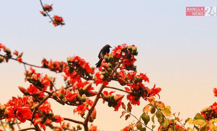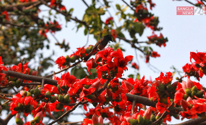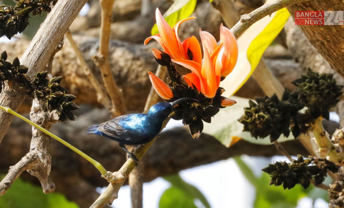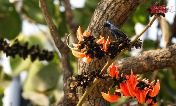 পলাশ ফুলের মধু আহরণ করছে পাখি। ছবি: ডিএইচ বাদল