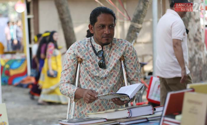 শারীরিক অসংগতিও বিচ্ছেদ ঘটাতে পারেনি বই প্রেমের সঙ্গে। অমর একুশে বইমেলা থেকে ছবিটি তুলেছেন ডিএইচ বাদল