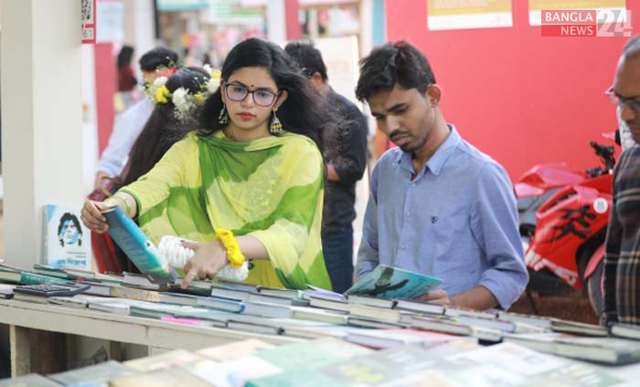 বিভিন্ন স্টল ঘুরে বই দেখছেন ও কিনছেন পাঠক ও দর্শনার্থীরা। অমর একুশে বইমেলা থেকে ছবিটি তুলেছেন ডিএইচ বাদল