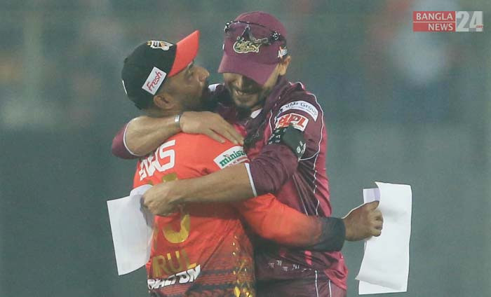 টসের পর দুই অধিনায়ক ইমরুল কায়েস ও মাশরাফির আলিঙ্গন। ছবি শোয়েব মিথুন