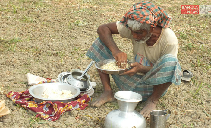 ফাল্গুনের পড়ন্ত দুপুরে পেঁয়াজ ক্ষেতে বসে ভাত খাচ্ছেন কৃষক। গ্রাম বাংলার দৃশ্যটি পাবনার বেড়া উপজেলার ঢালারচর থেকে ছবিটি তুলেছেন টিপু সুলতান।