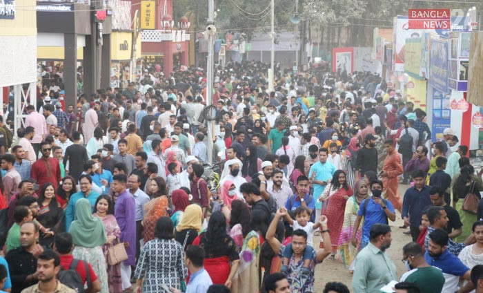 হামলার হুমকি উপেক্ষা করে প্রাণবন্ত ও উৎসবমুখরভাবে বইমেলায় ক্রেতা-দর্শনার্থীরা। ছবি তুলেছেন শাকিল আহমেদ।