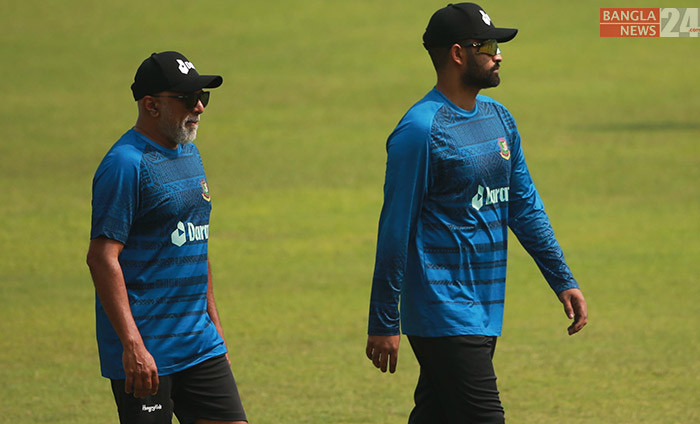 মিরপুর শের-ই-বাংলা স্টেডিয়ামে বাংলাদেশ জাতীয় ক্রিকেট দলের কোচ চন্ডিকা হাথুরুসিংহ ও তামিম ইকবাল। ছবি: শোয়েব মিথুন