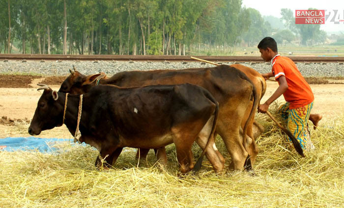 পাবনার ঢালারচরে এক কিশোর গরু দিয়ে মলন দিচ্ছেন চৈতালী ফসল সরিষা। ঈশ্বরদী-ঢালারচর রেলরুটের পাবনার ঢালারচর রেলস্টেশন থেকে ছবিটি তুলেছেন টিপু সুলতান।