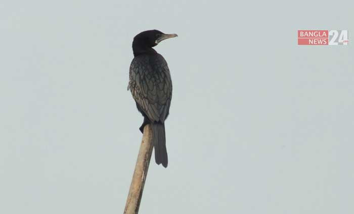 বাঁশের খুঁটিতে বসে আছে পানকৌড়ি। ছবি: টিপু সুলতান
