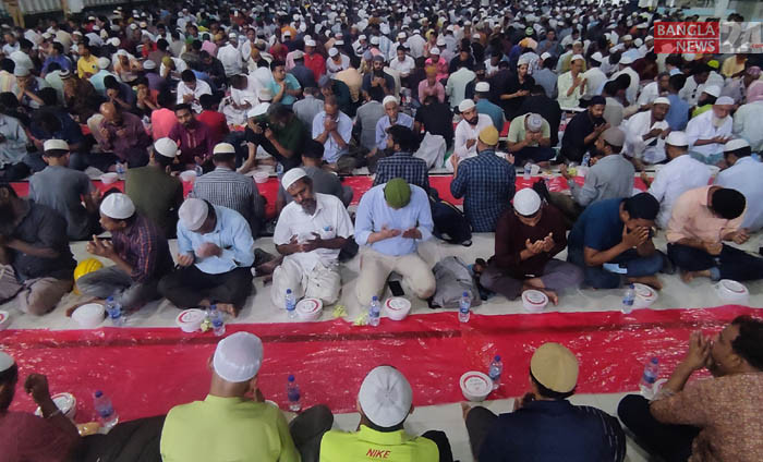 বসুন্ধরা গ্রুপের উদ্যোগে জাতীয় মসজিদ বায়তুল মোকাররমে ইফতারের আয়োজনে মুসল্লিরা। ছবি: শোয়েব মিথুন