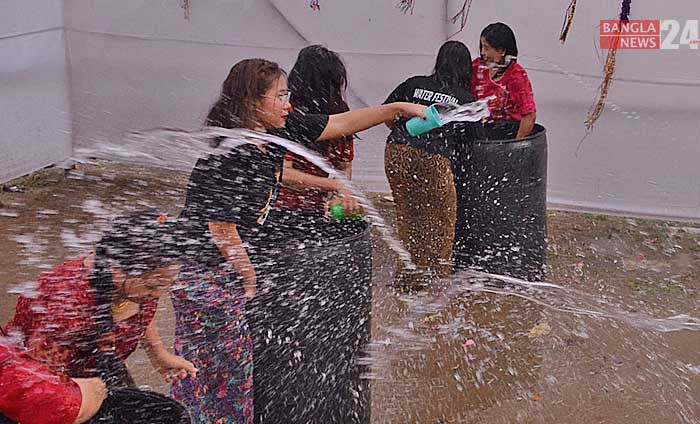 নববর্ষকে স্বাগত জানিয়ে চট্টগ্রাম নগরীর কাতালগঞ্জ বৌদ্ধ বিহারে রাখাইন স্টুডেন্ট অ্যাসোসিয়েশন আয়োজন করে জলকেলি উৎসবের। ছবি: বাংলানিউজ