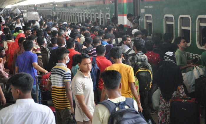 কমলাপুর রেল স্টেশনে ঈদে ঘরমুখো মানুষের উপচেপড়া ভিড়। ছবি: সাকিল আহমেদ।