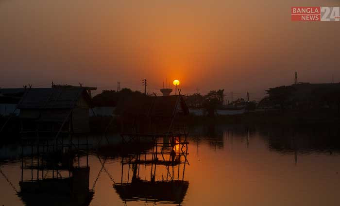 আশুলিয়া বেড়িবাঁধ আড়াল করে নেমে যাচ্ছে সূর্য। ছবি: রাজীন চৌধুরী