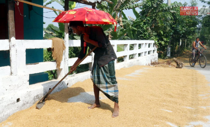 রোদের মধ্যে ছাতা মাথায় ধান শুকানোর কাজ করছেন এক যুবক। ছবিটি বরিশালের চৌহঠা এলাকা থেকে তুলেছেন এন আমিন রাসেল।