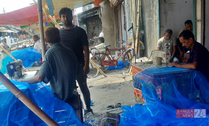ইরি-বোরো ধান শুকানোর নেট তৈরি চলছে সৈয়দপুরের রেললাইনের পাশে। ছবি: মো. আমিরুজ্জামান