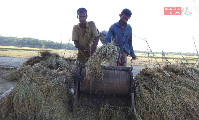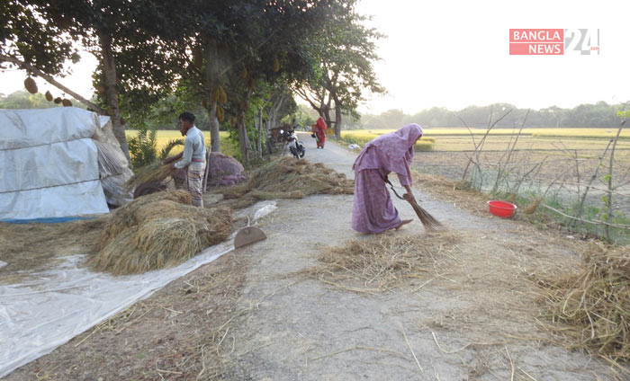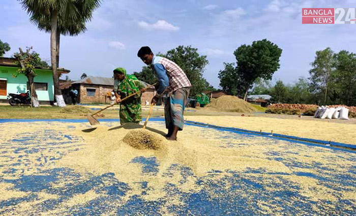 ধান শুকানোর কাজে ব্যস্ত কৃষাণ ও কৃষাণী। ছবি: আরিফ জাহান