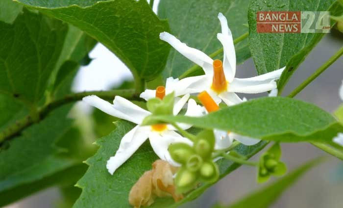 সবুজ পাতার মাঝে ঝরে পড়েছে শিউলী ফুল। ছবি: টিপু সুলতান